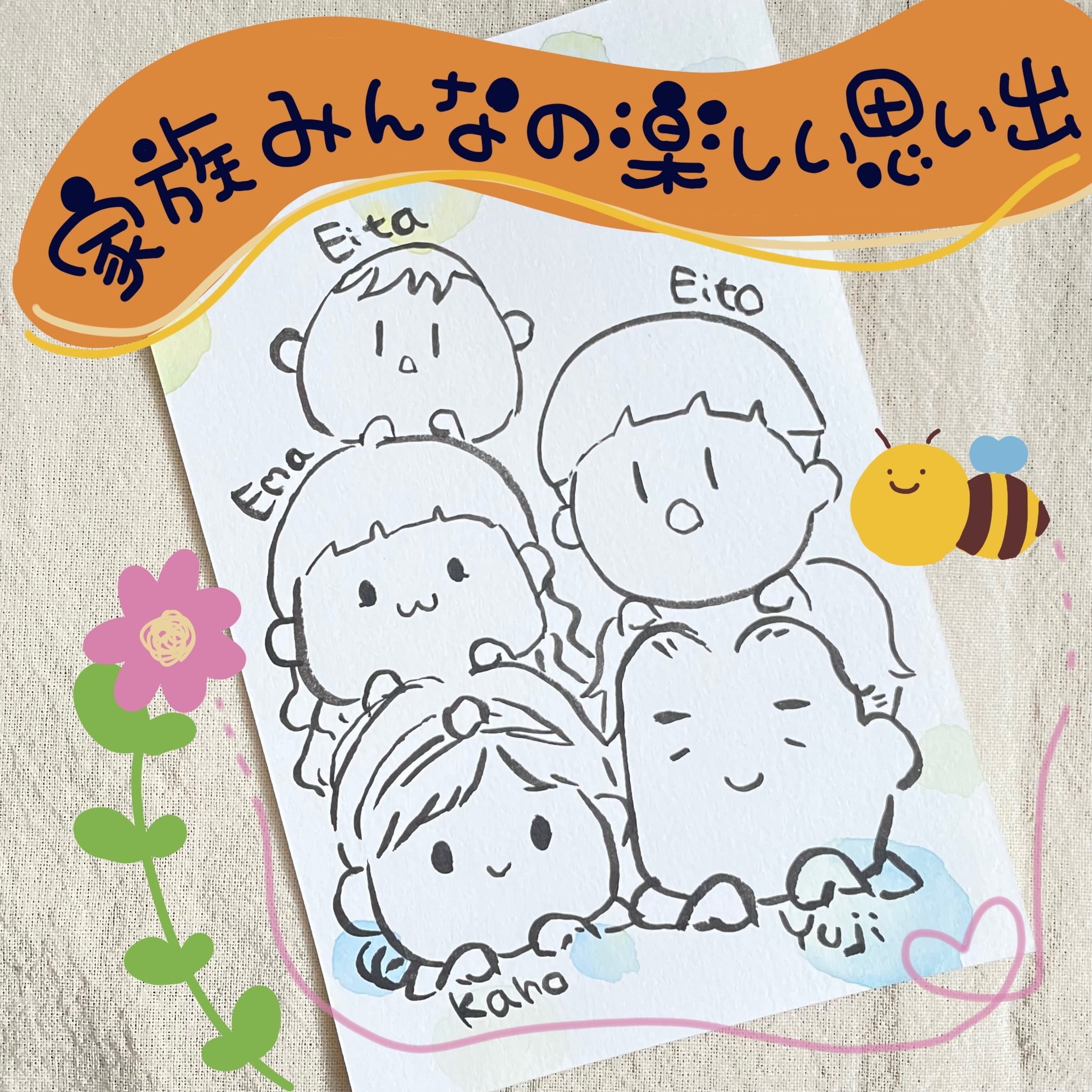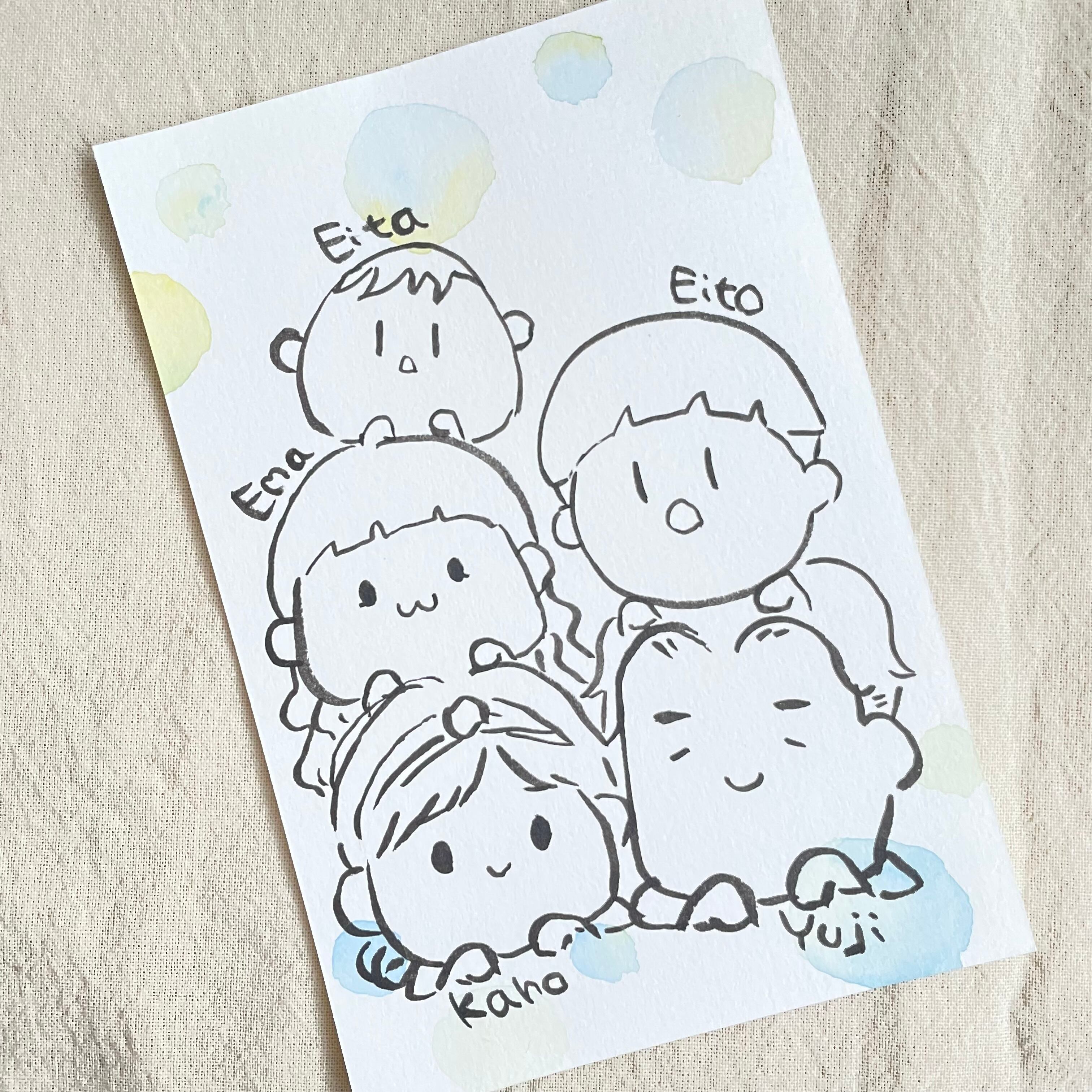 ハガキサイズならそのまま壁に貼るも良し、玄関の小スペースに飾るも良し!そしてなんといっても小さなハガキサイズ目一杯に、家族の似顔絵はにぎやかでより可愛く見えます。